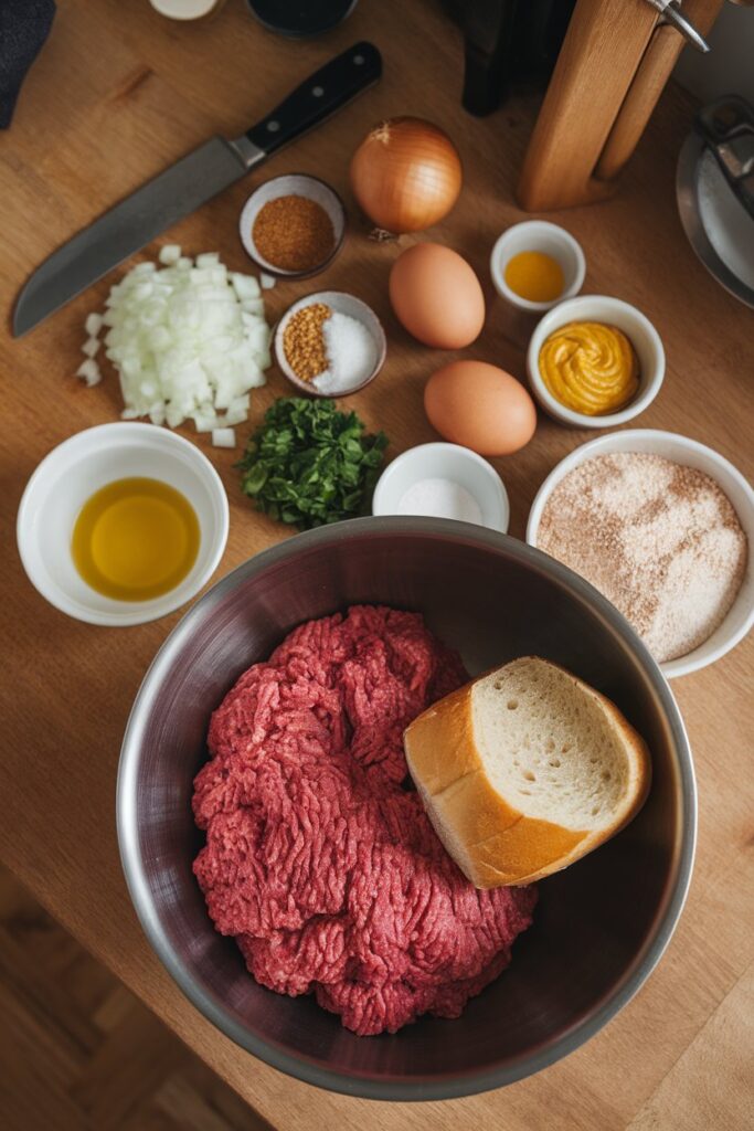 3. Teig mischen: Hackfleisch, eingeweichtes Brötchen, die gedünsteten Zwiebeln, Eier, Senf, Petersilie und die Gewürze in eine große Schüssel geben. Alles mit den Händen oder einem Löffel locker vermengen, ohne zu fest zu drücken. Die Masse sollte homogen, aber luftig bleiben.