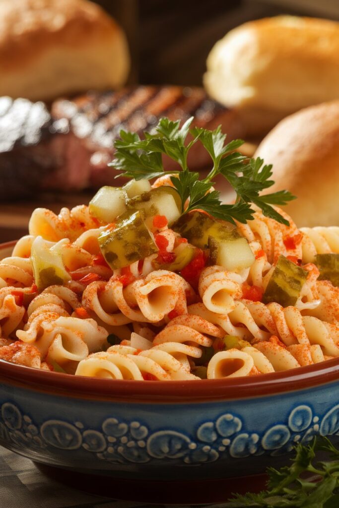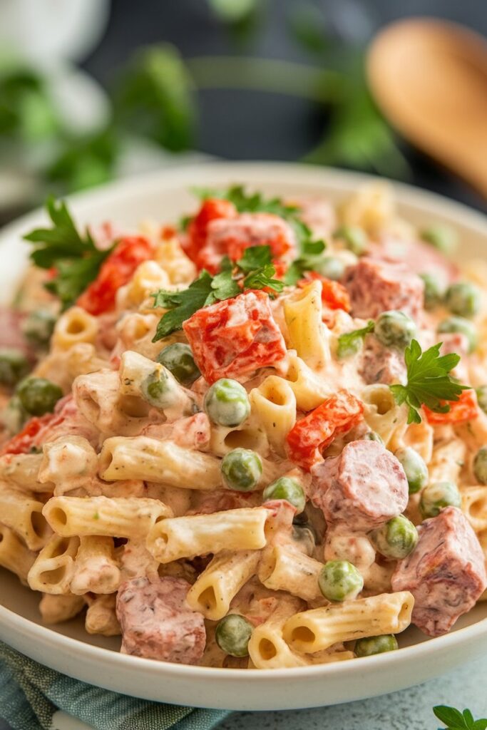 Ergibt etwa 6 Portionen cremig-würzigen Nudelsalat, perfekt als Beilage zu Gegrilltem, auf Partys oder als leichtes Mittagessen an heißen Tagen.