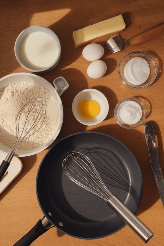 Pfanne vorbereiten: Eine beschichtete Pfanne auf mittlerer Hitze erwärmen. Etwas Butter oder Öl in die Pfanne geben und gleichmäßig verteilen. Die Pfanne sollte heiß genug sein, damit der Teig beim Eingießen sofort leicht anzieht, aber nicht so heiß, dass er sofort verbrennt. Die richtige Temperatur ist entscheidend für gleichmäßiges Bräunen.