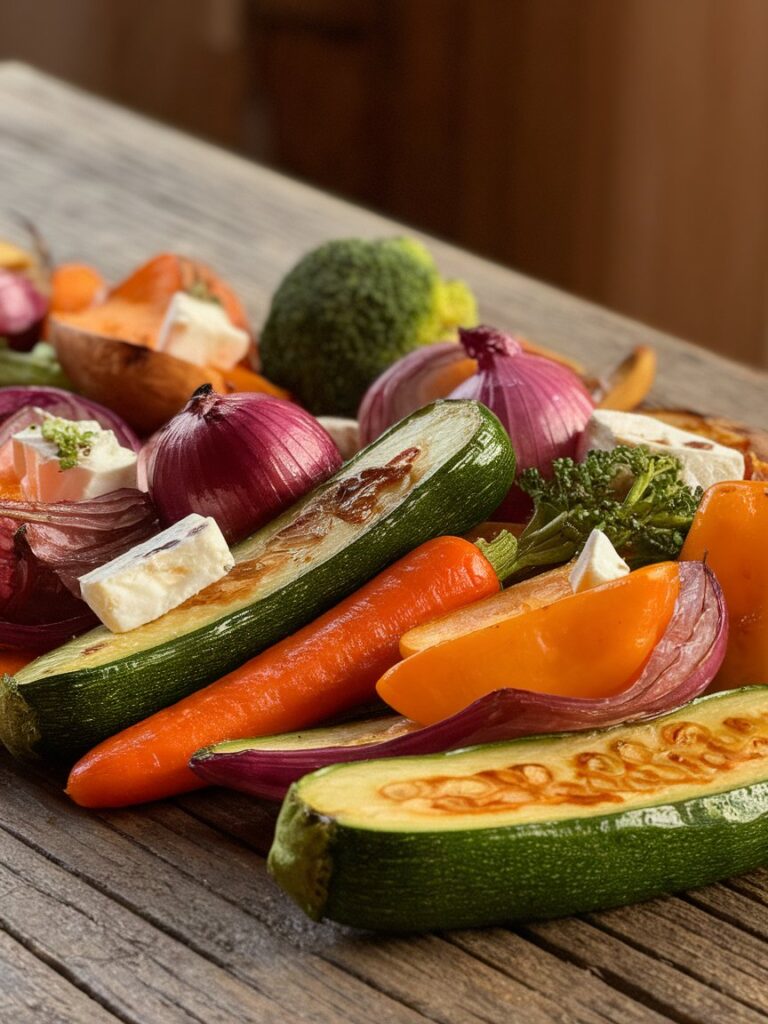 Ein farbenfrohes, aromatisches Gemüsegericht mit intensiv gerösteten Aromen. Zucchini werden weich und leicht karamellisiert, Paprika werden süß und aromatisch, Brokkoli bekommt knusprige Ränder und ein kräftiges Aroma, Karotten entwickeln eine natürliche Süße, während rote Zwiebeln mild und weich werden. Der Feta wird leicht gebräunt, schmilzt an manchen Stellen, bleibt aber in seiner Struktur cremig und verleiht dem Gericht einen herrlich salzigen, würzigen Kontrast. Ein einfaches, aber geschmacksintensives Gericht.